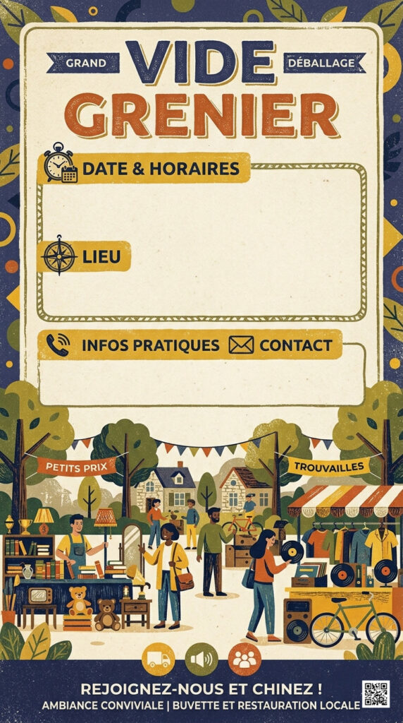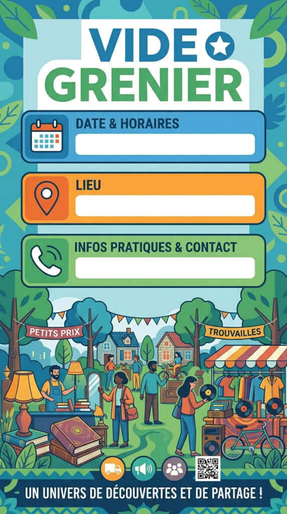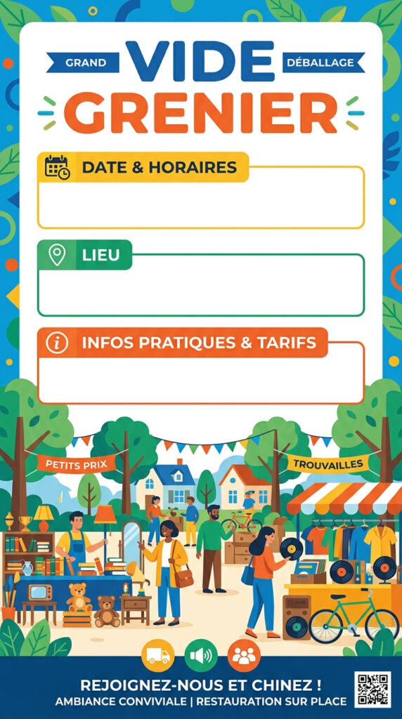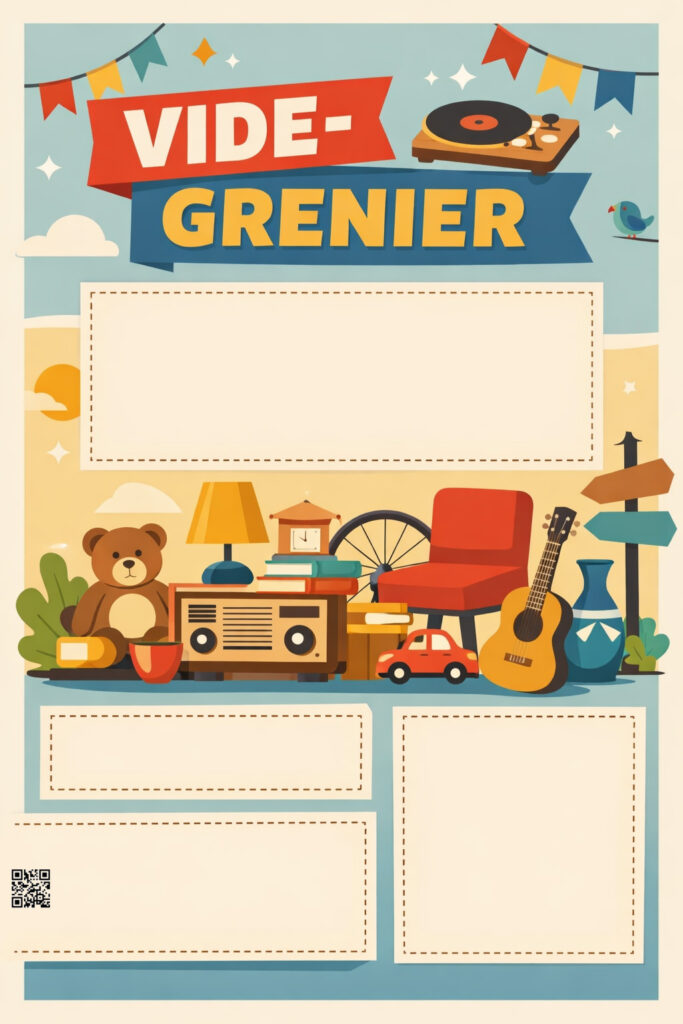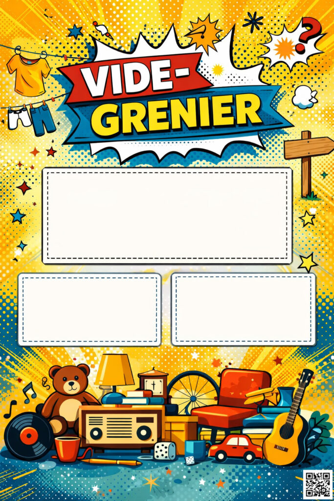 Je me suis amusé à faire quelques affiches pour des vide greniers, si vous les voulez vous pouvez les télécharger gratuitement, il y’a juste dessus un QRCODE qui mène à mon site mais si vous le souhaitez vous pouvez l’enlever, tout est gratuit.